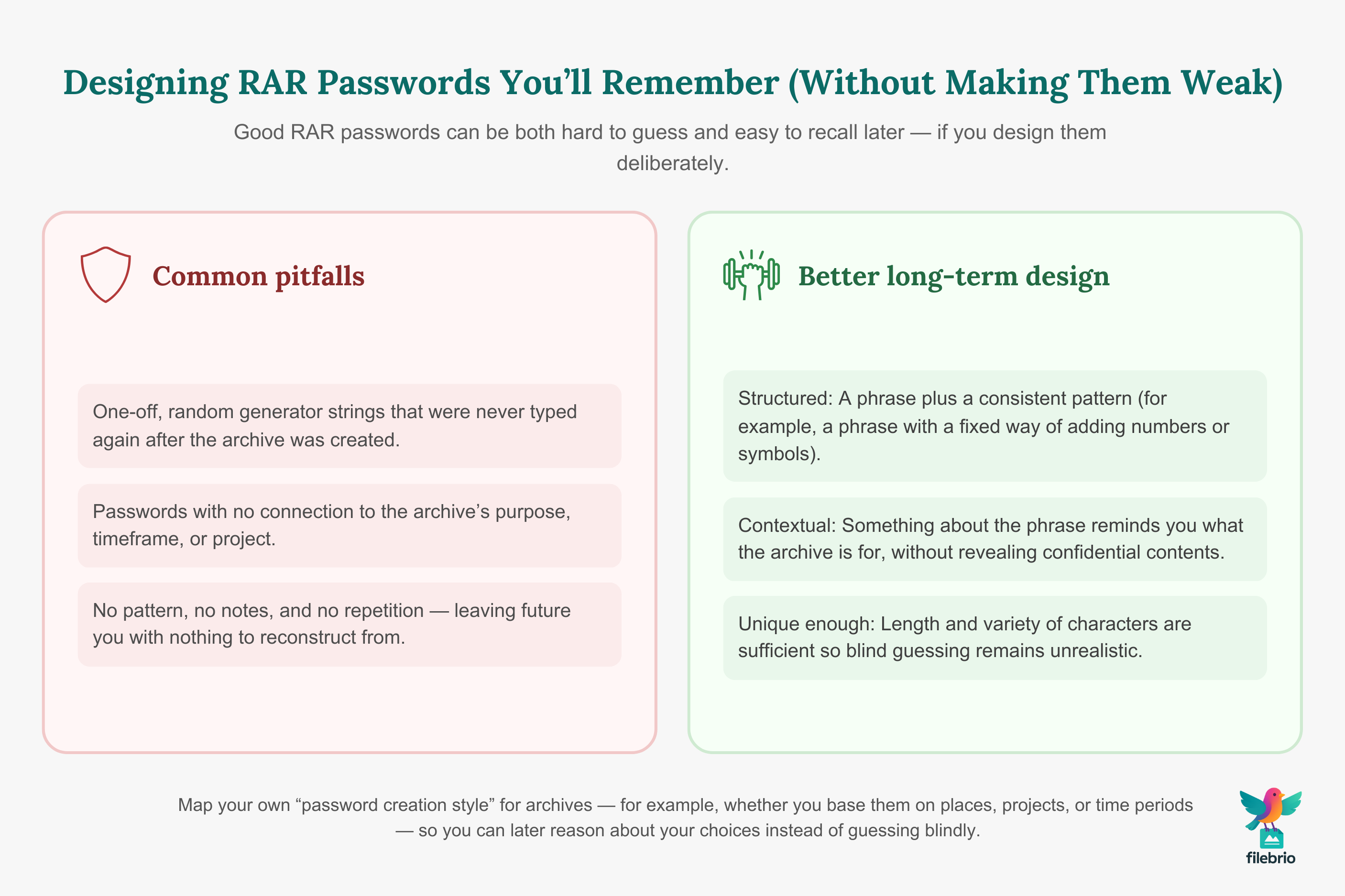 You can further strengthen your retention by keeping a high-level map of your “password creation style” for archives — for example, whether you tend to base them on places, projects, or time periods. Analyses like those in how to study patterns behind your RAR password choices ↗️ can help you understand your own habits and formalize them into a deliberate system rather than a random collection of ad-hoc choices.
