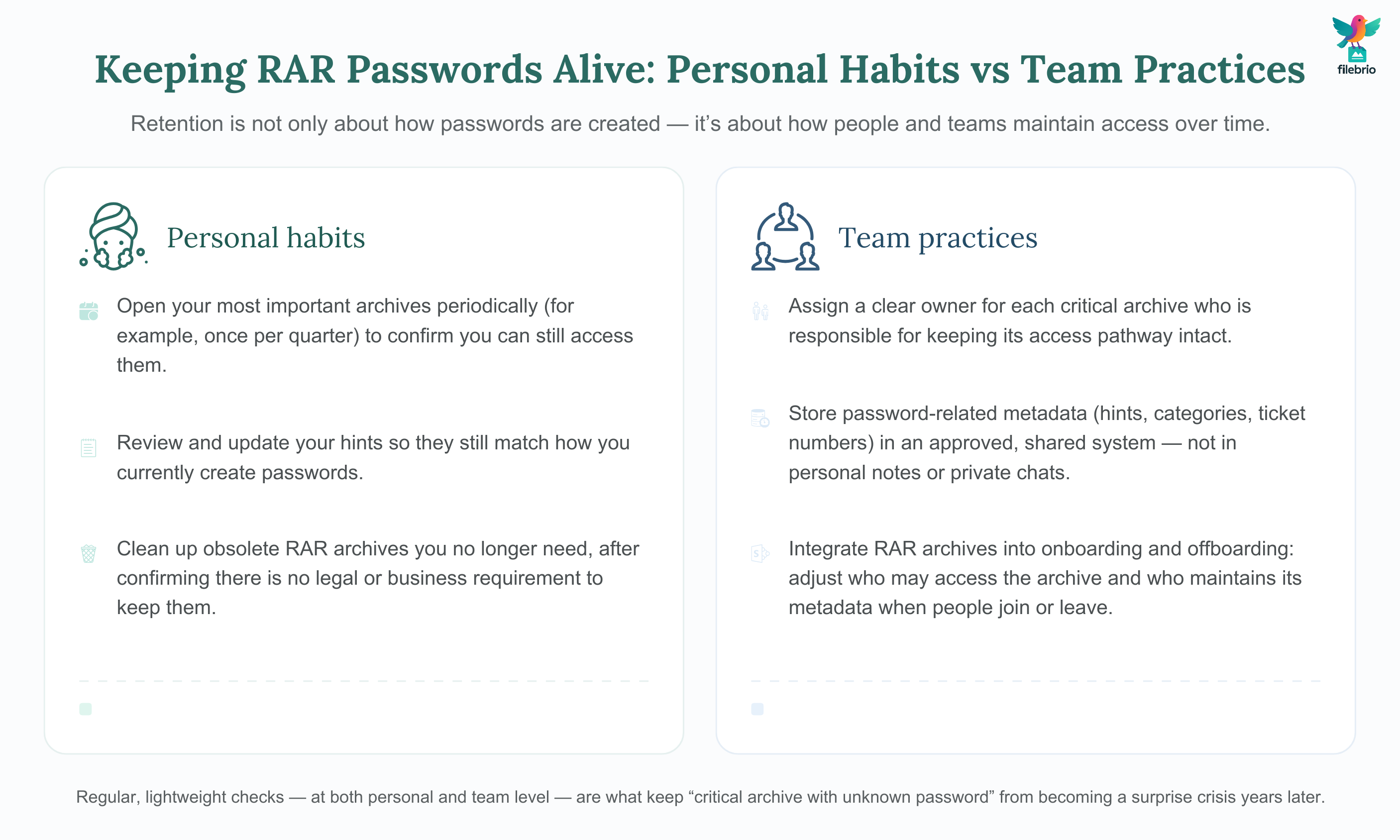 At the personal level, this means favoring structured, memorable passphrases over random character strings; using consistent patterns for specific categories of archives; and maintaining separate, secure metadata that reminds you what kind of phrase you chose without revealing it directly. At the team level, it means treating RAR passwords as part of your broader access management process — with defined owners, documented hints, and safe rotation rules.