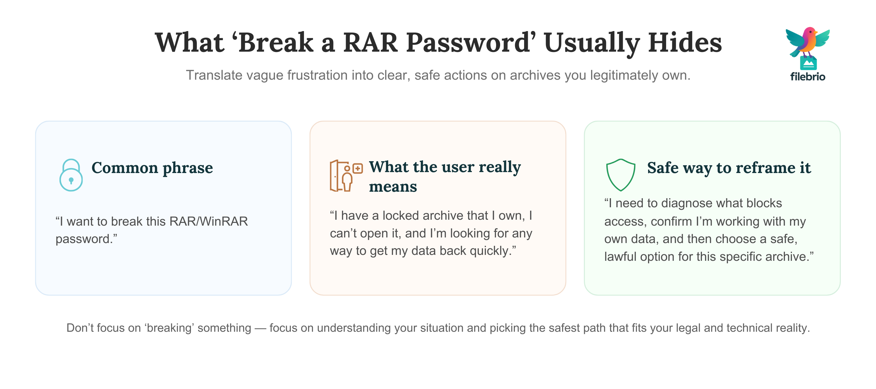 Infographic explaining what people really mean when they say “break a RAR password” and how to translate that into safe, legal actions on their own archives.
