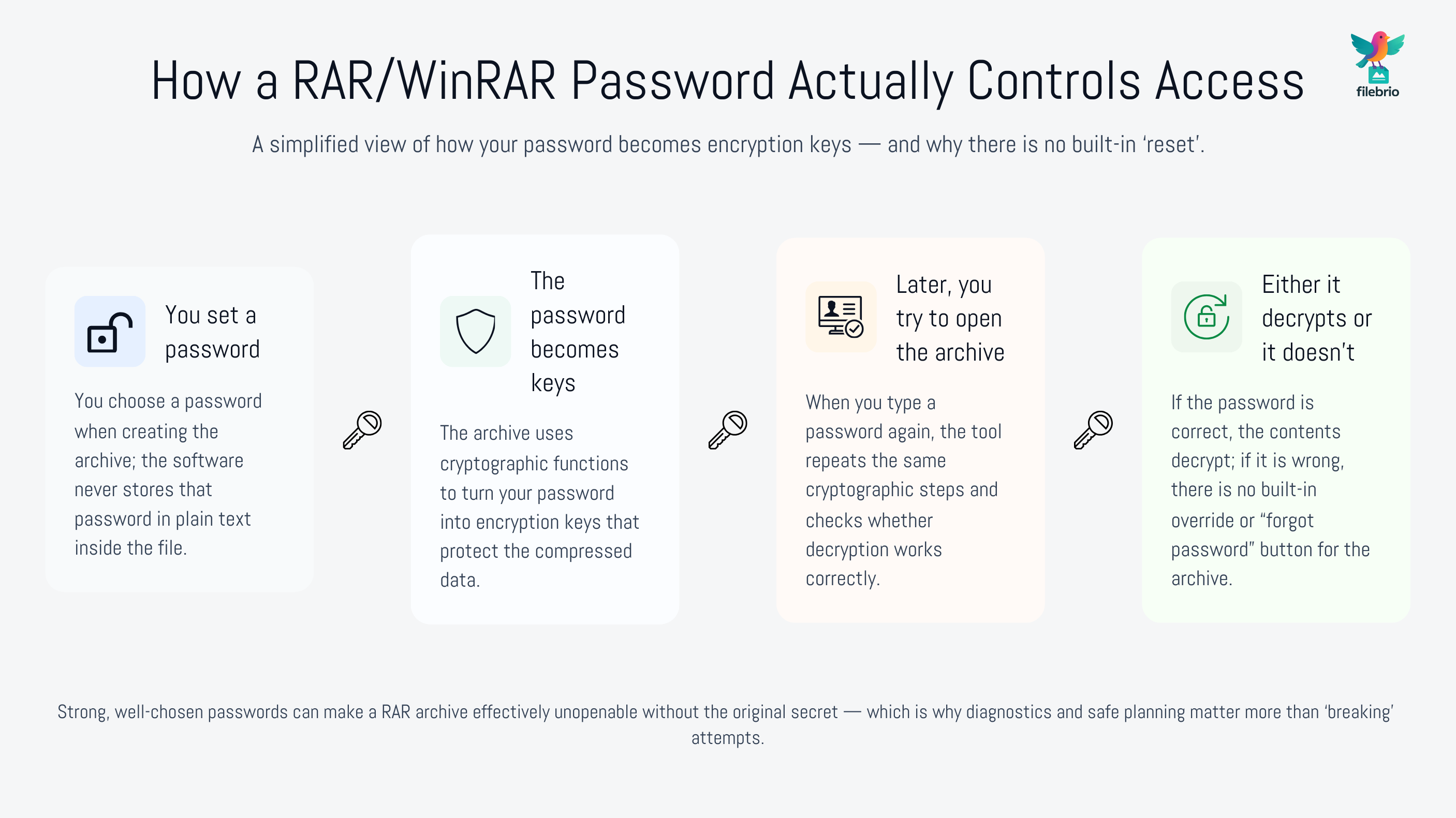 To evaluate what is possible in your situation, you need a conceptual picture of how RAR encryption works. RAR archives do not store your password. Instead, the password you type is processed through cryptographic functions that derive keys used to decrypt the archive’s contents. If the password is wrong, the decryption fails and you see errors or repeated prompts. There is no built-in “reset” comparable to email or account recovery processes.