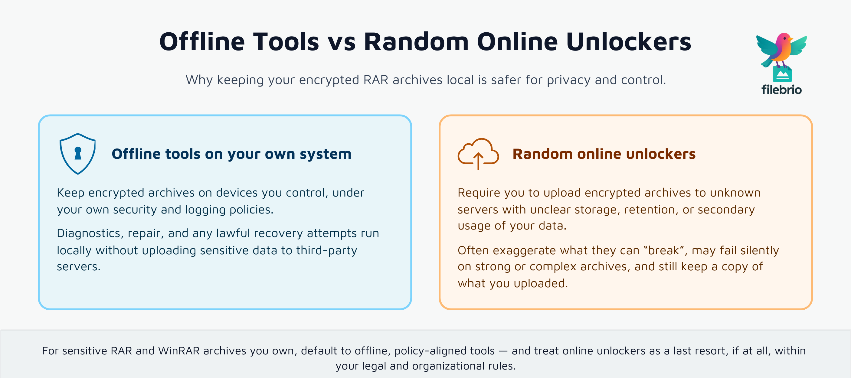 Comparison infographic showing the difference between using offline tools and random online unlockers for handling encrypted RAR archives.