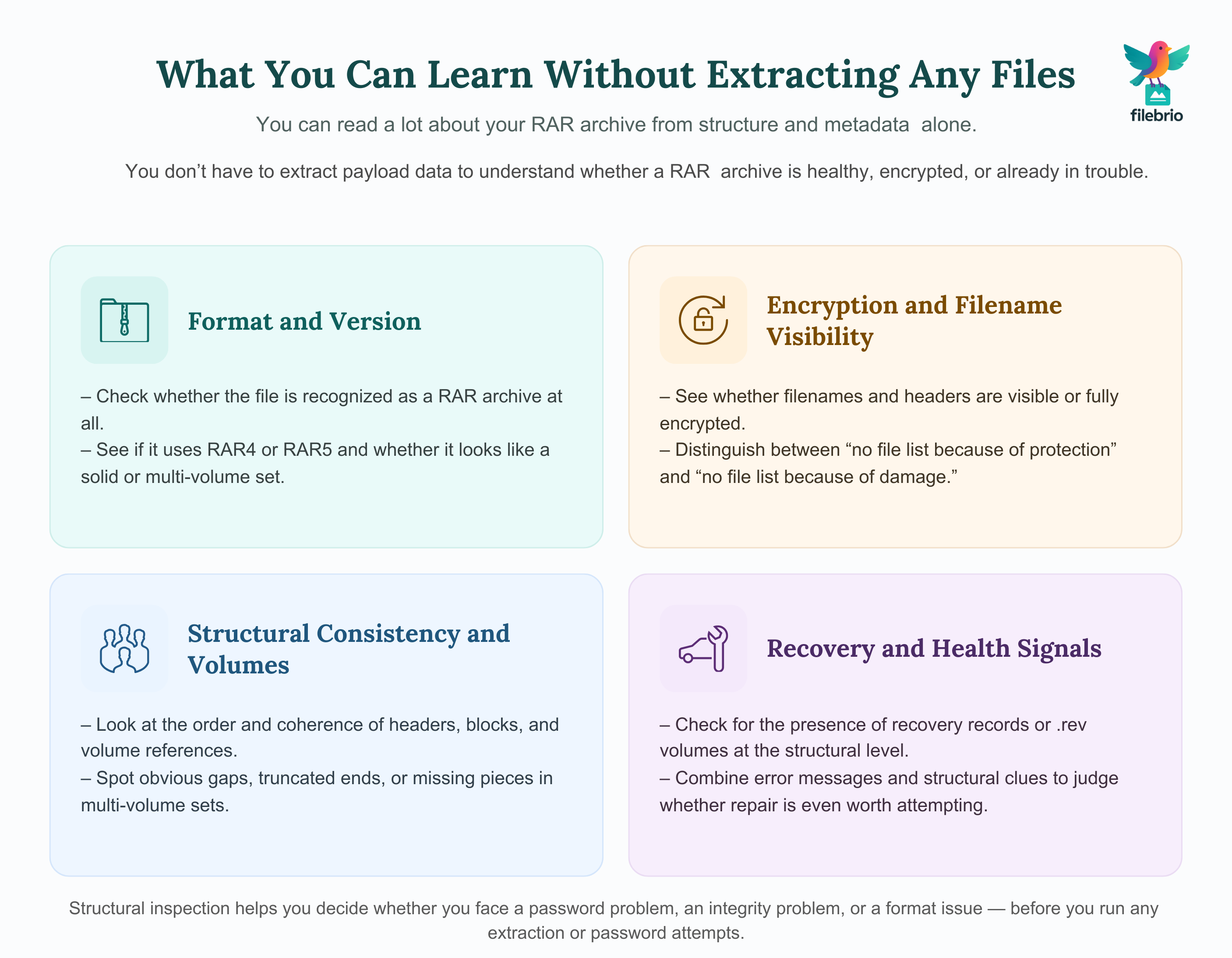 | Structure & header overview | Determine quickly whether your archive is usable at all. | Provides high-level maps for RAR4/RAR5, volumes, and recovery records. |
