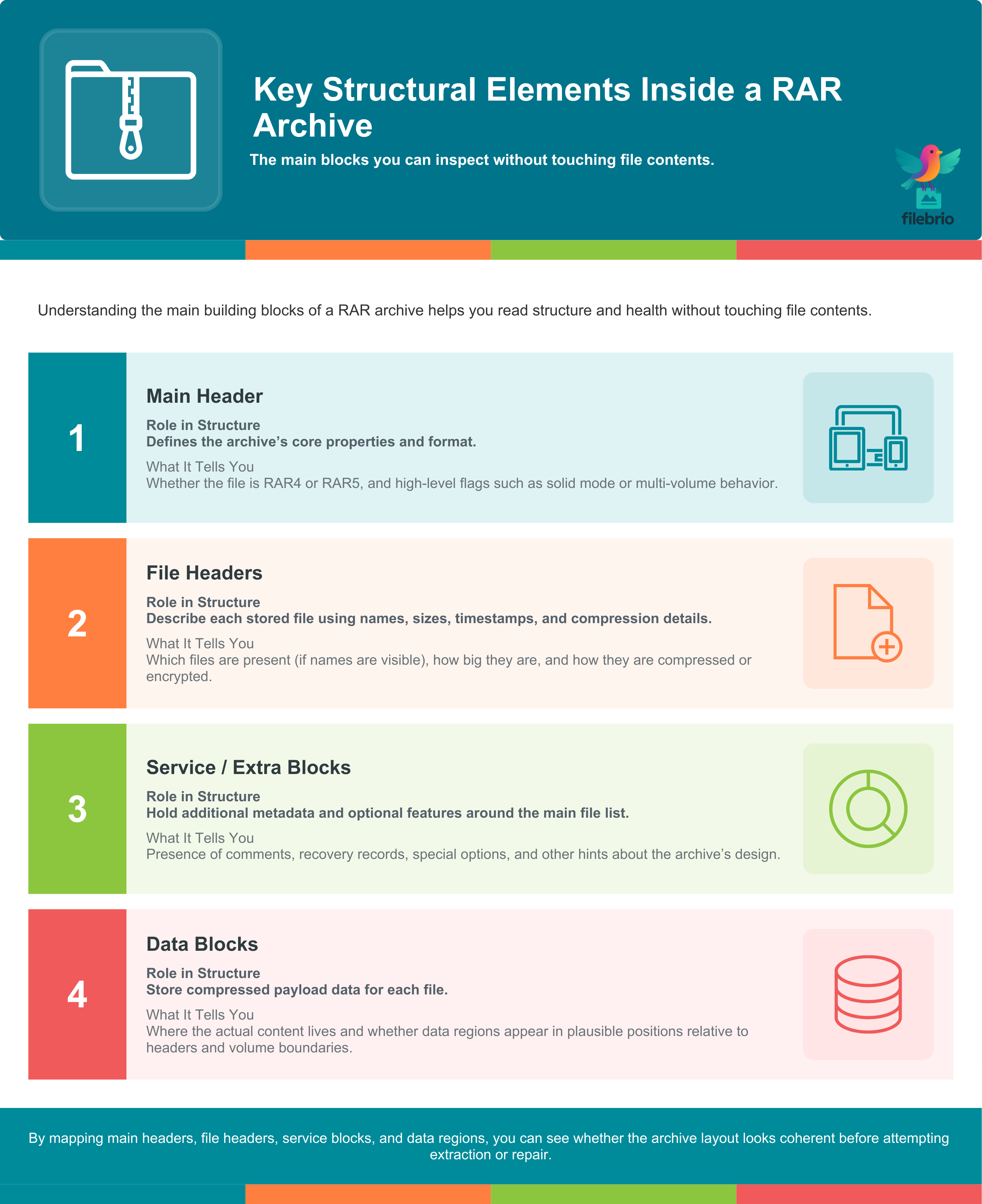 Conceptually, RAR archives are composed of a sequence of blocks. Each block has a type, some flags, and optionally some attached data. Taken together, these blocks describe where volumes start and end, where file data lives, and how recovery-related features are arranged. When you “inspect structure,” you’re effectively reading these labels and checking whether they make sense, without touching the underlying file payload.