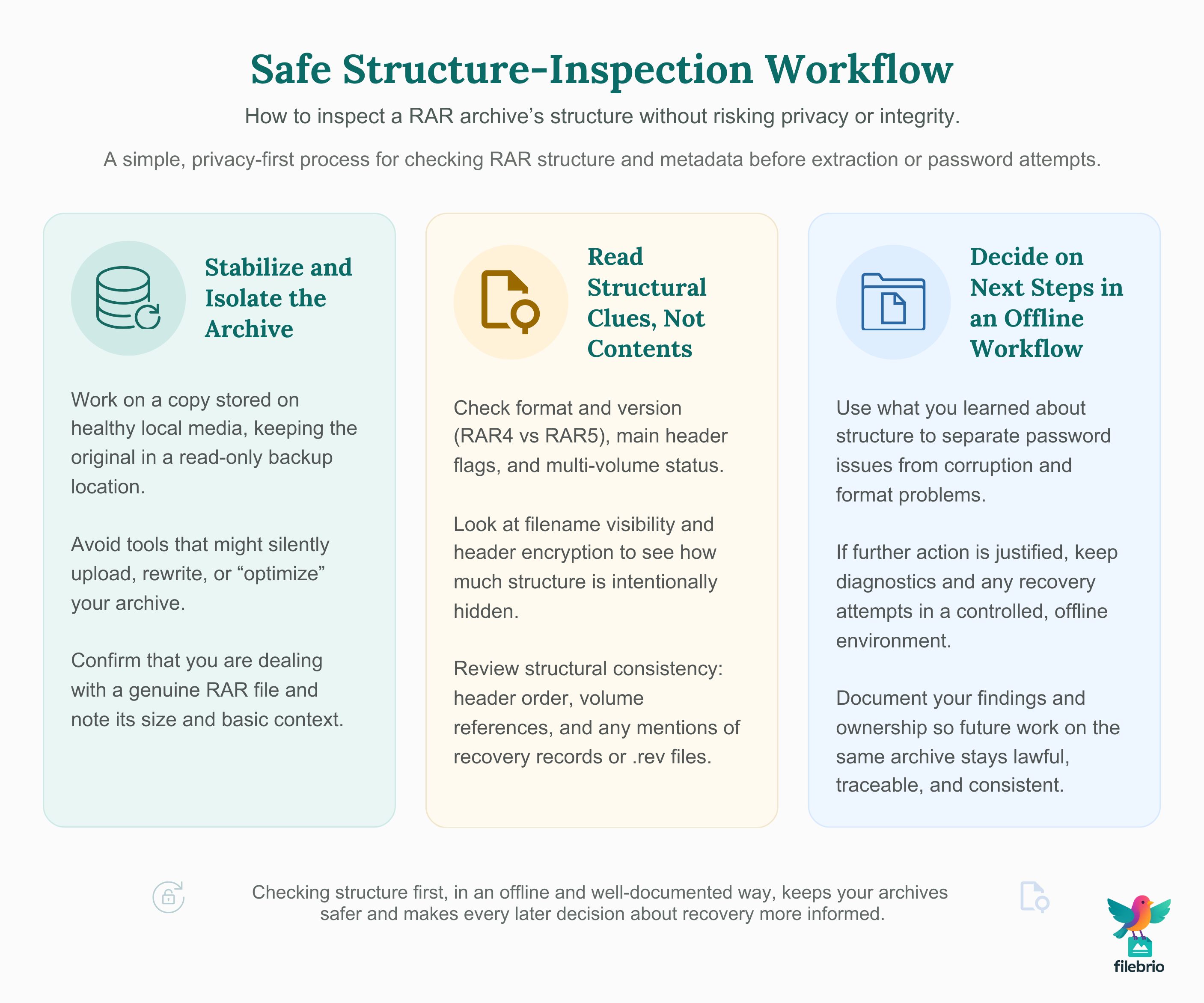 - Use offline, reputable tools. Avoid any utility that uploads your archive to a remote server. Offline tools are safer for privacy and align with the principles behind reading RAR metadata to understand what went wrong ↗️ locally.