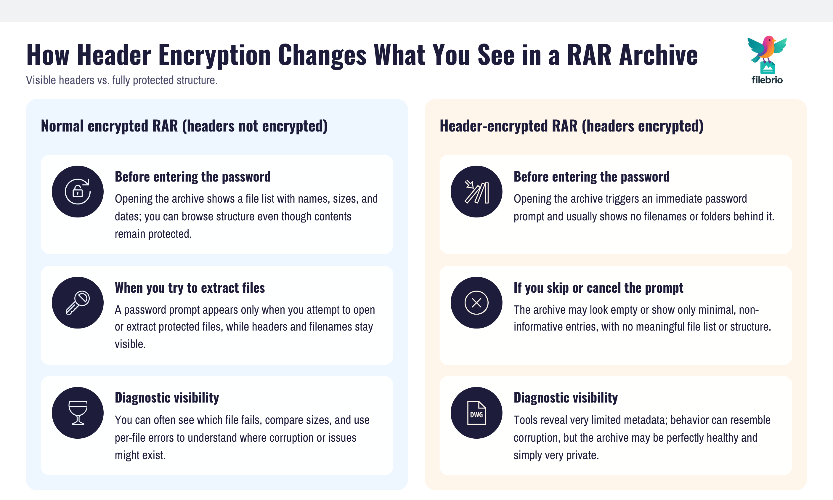Every RAR archive has headers — structural blocks that describe what’s inside: filenames, timestamps, sometimes size information and other metadata. Without header encryption, these details may be visible even if the actual file contents remain protected. That visibility can be convenient for diagnostics, but it also leaks information.