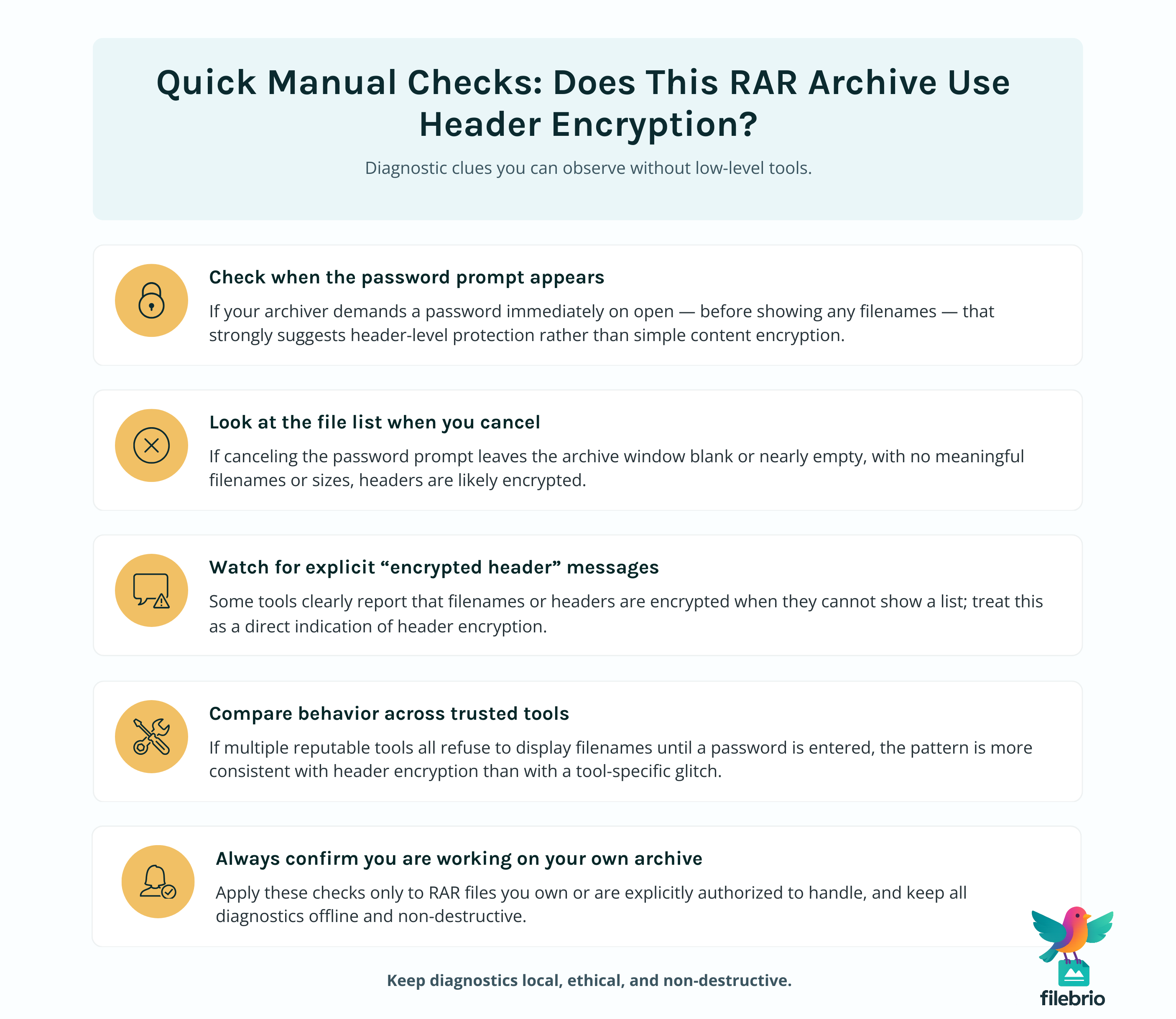 You can often make a basic, high-level judgment about header encryption using careful manual checks — again, only on archives you own or are clearly authorized to handle.
