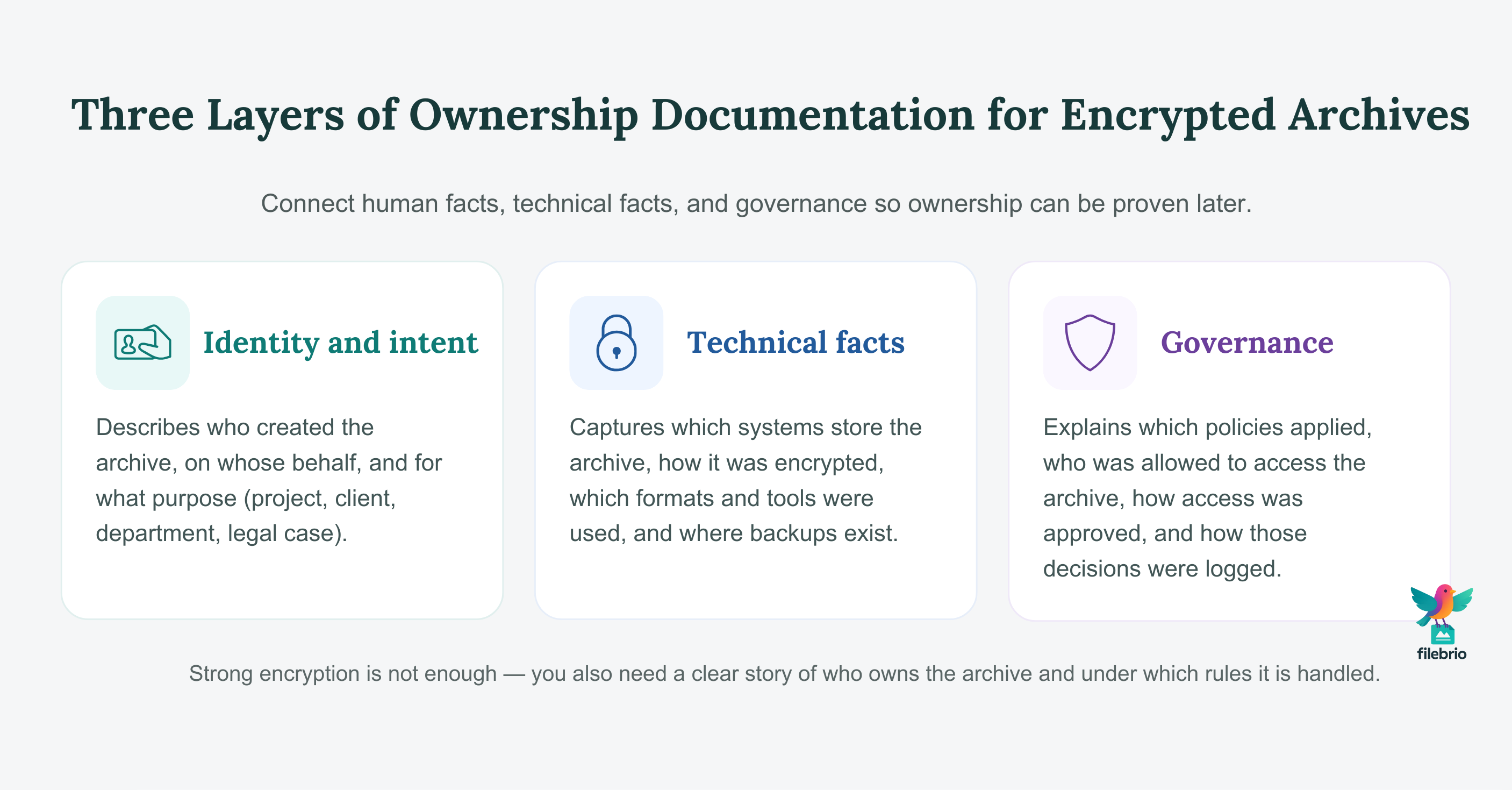 Infographic showing three layers of ownership documentation for encrypted archives: identity and intent, technical facts, and governance.