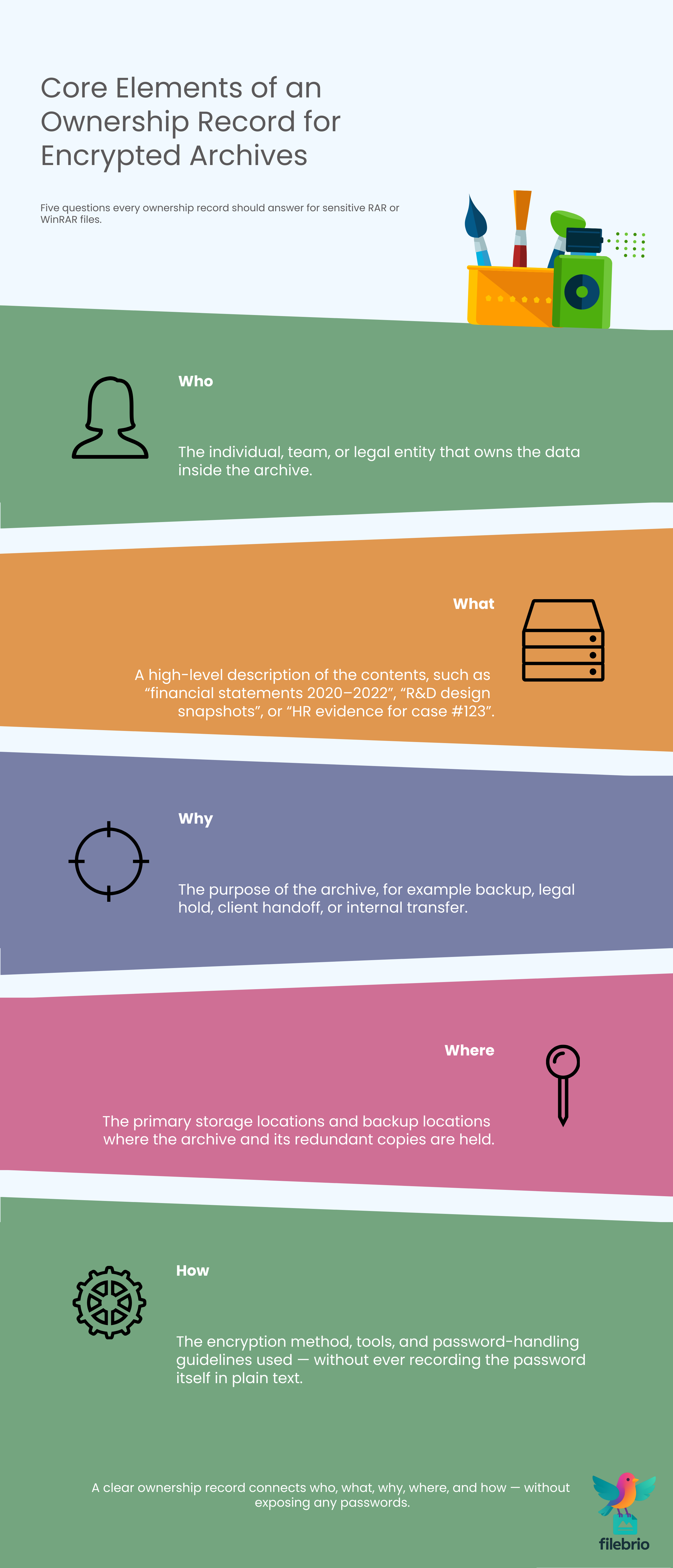 Infographic listing five key elements of an ownership record for encrypted RAR archives: who, what, why, where, and how.