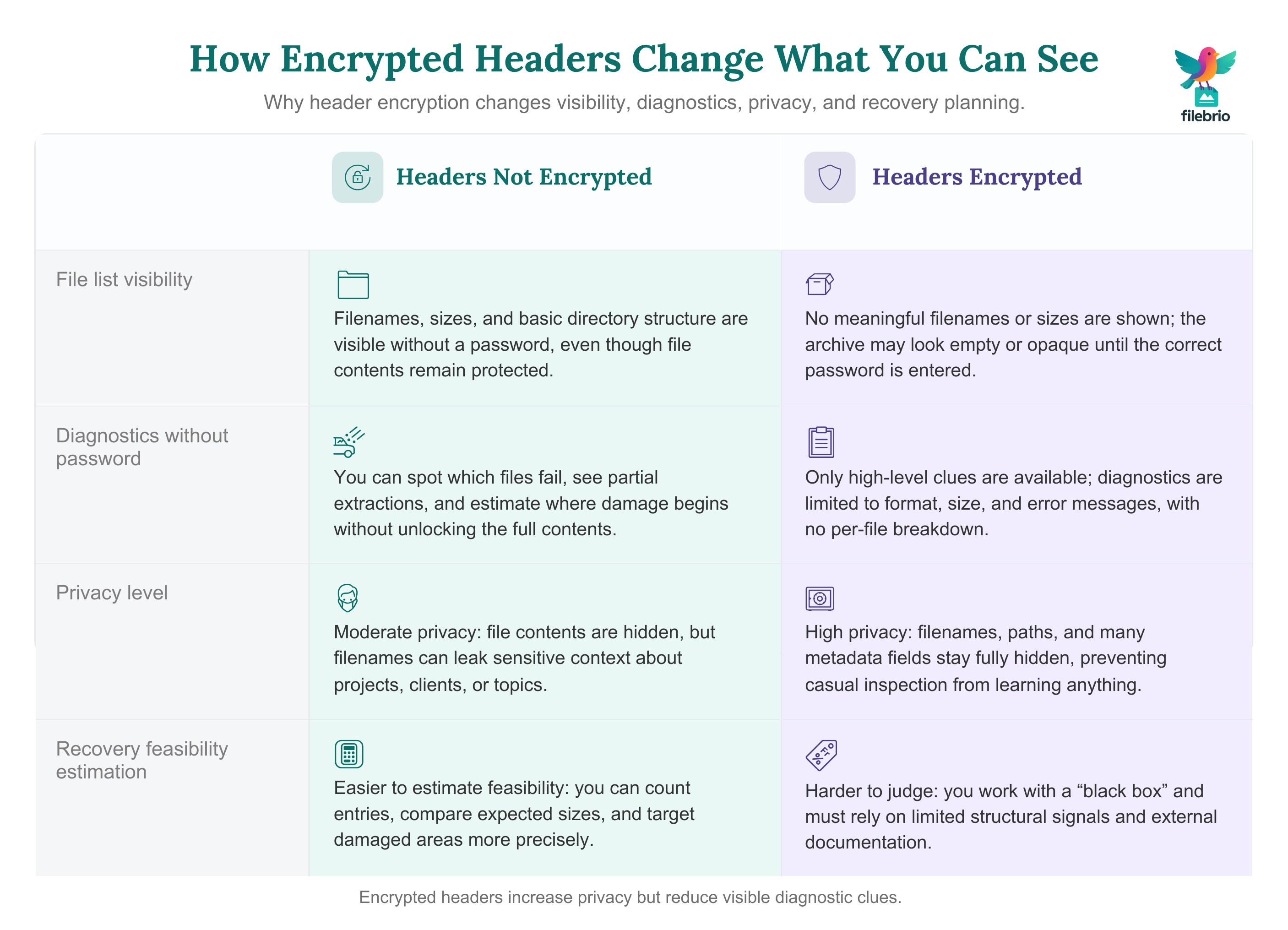 That absence of visibility makes it harder to reason about recovery feasibility. For example, you might normally use partial extractions to determine whether only the tail of an archive is damaged. With encrypted headers, that kind of fine-grained diagnostic becomes much more limited.
