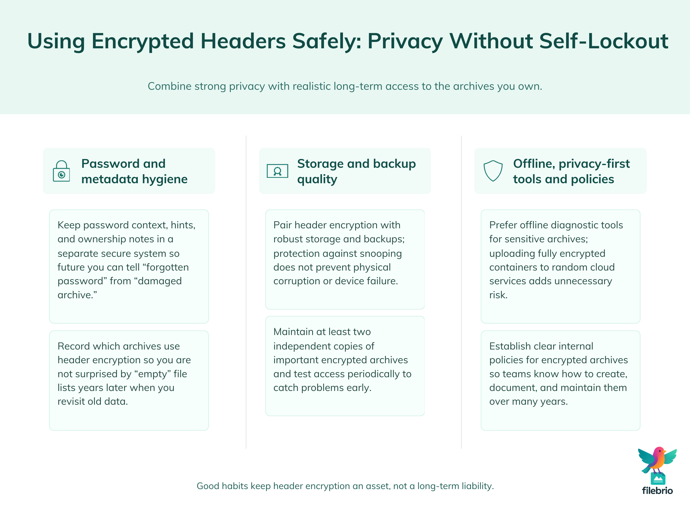 Strong header encryption works best when combined with good password hygiene, resilient storage, and clear long-term access policies.
