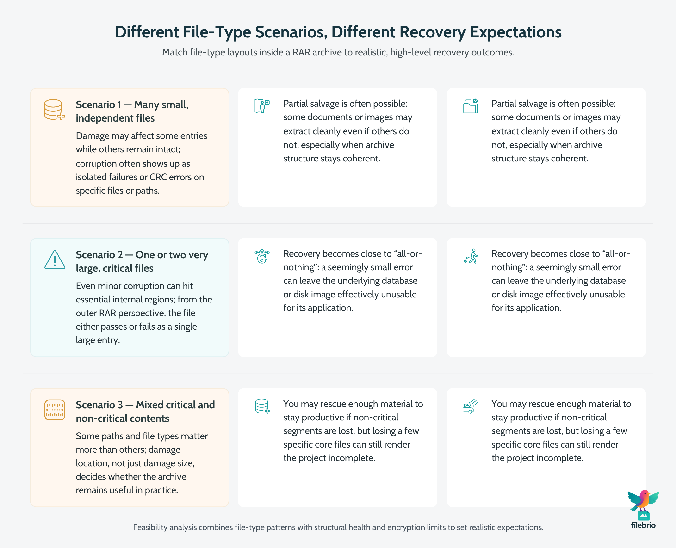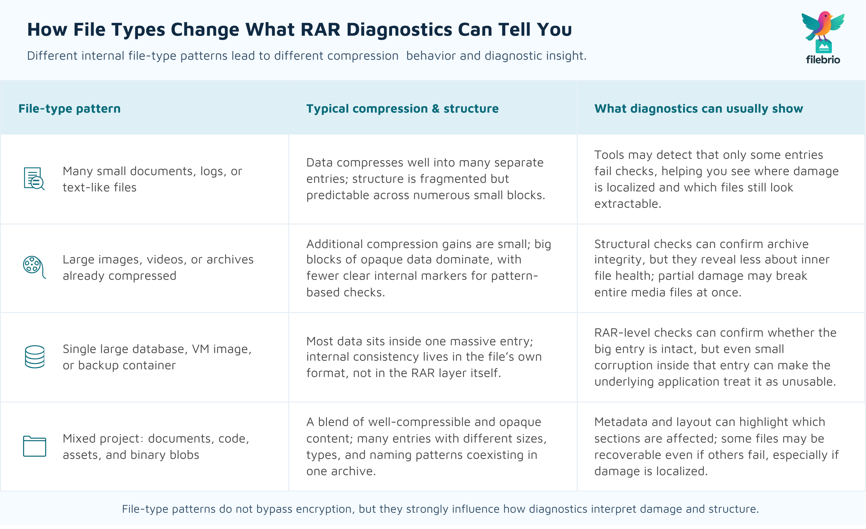 The types of files inside a RAR archive play a major role in how much diagnostics can reveal and how realistic recovery expectations should be. A single huge VM image, a collection of thousands of small documents, or a mix of media files all create different structural patterns once compressed. These patterns affect how RAR metadata looks, how error messages should be interpreted, and whether partial damage is survivable. Some file categories compress cleanly and leave predictable structure that makes high-level diagnostics more informative; others are already-compressed or opaque, meaning structural checks provide fewer clues.