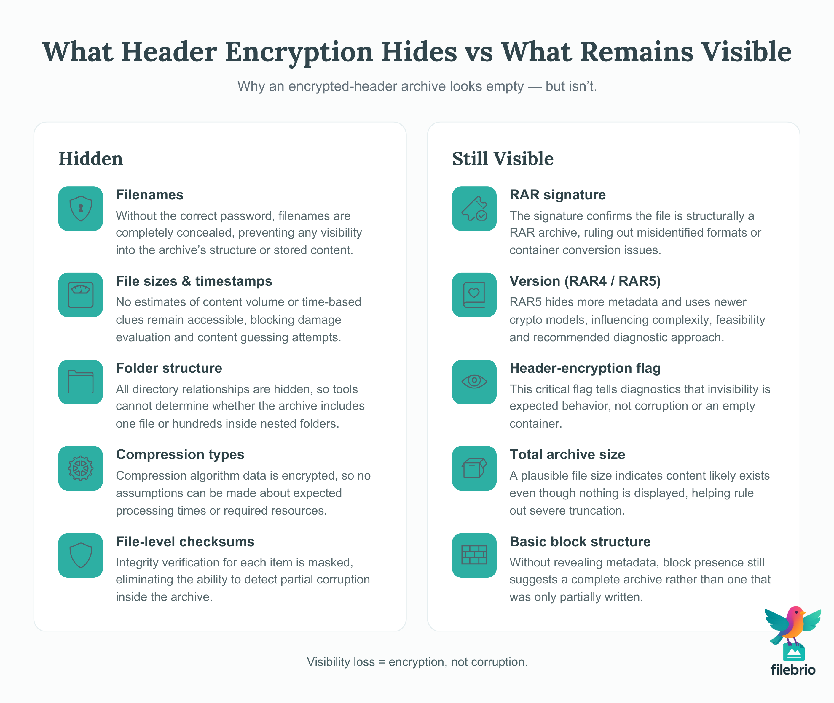 Understanding what header encryption conceals—and what remains detectable—helps you determine whether the file is healthy, whether password access is still feasible, and whether damage has affected the structure in ways that complicate recovery.
