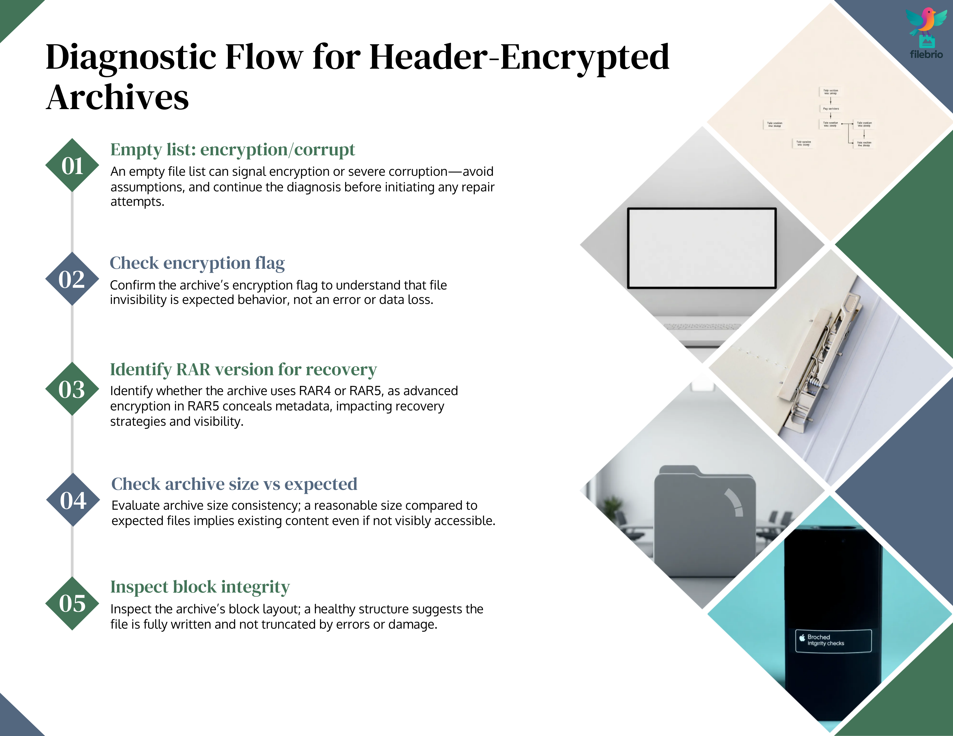 FileBrio RAR Master provides a safe, high-precision diagnostic environment specifically built for header-encrypted RAR archives: