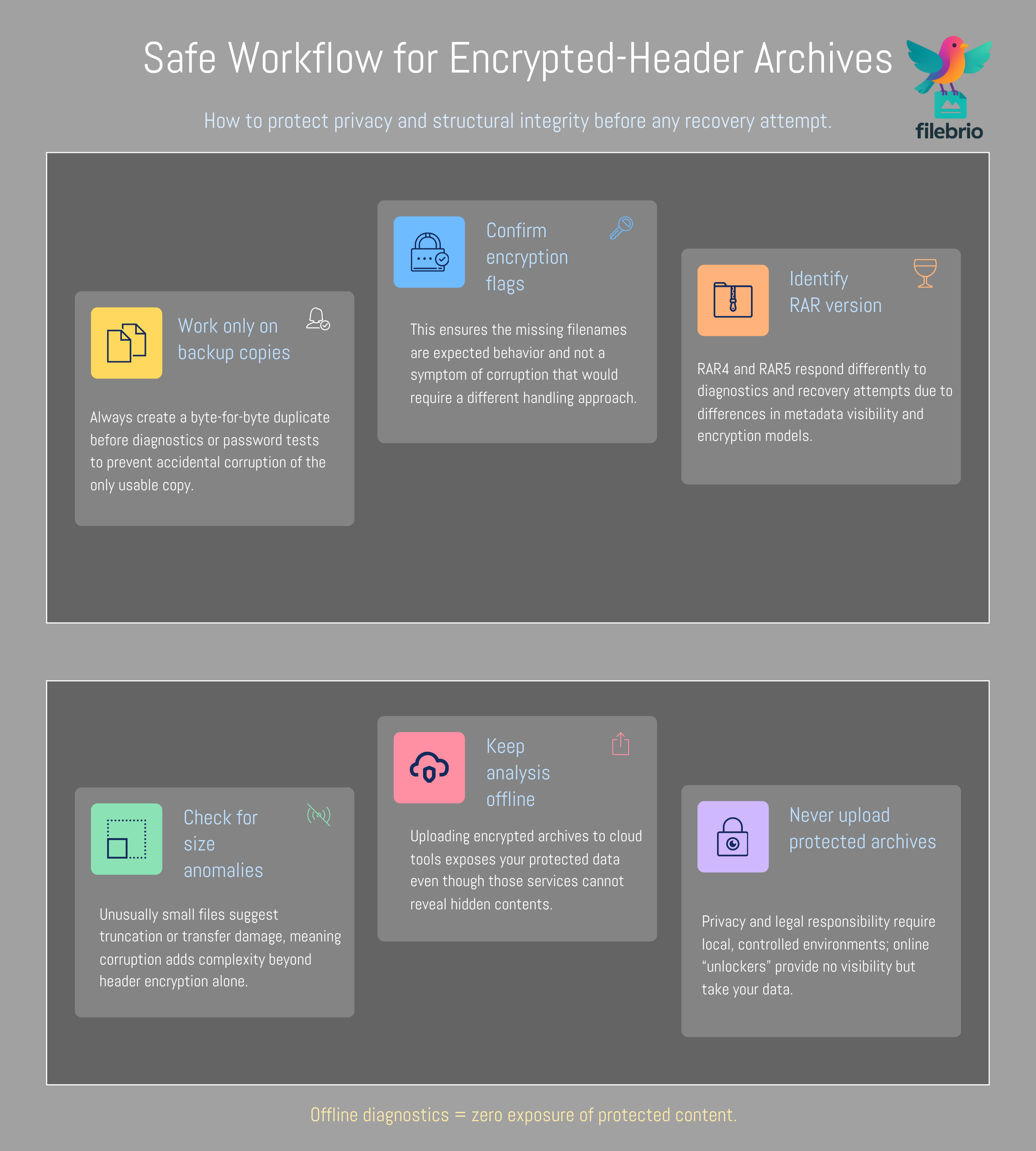 This aligns with safe diagnostic practices outlined in initial actions to preserve your damaged RAR data ↗️ and safe approaches to diagnosing your protected archive ↗️.