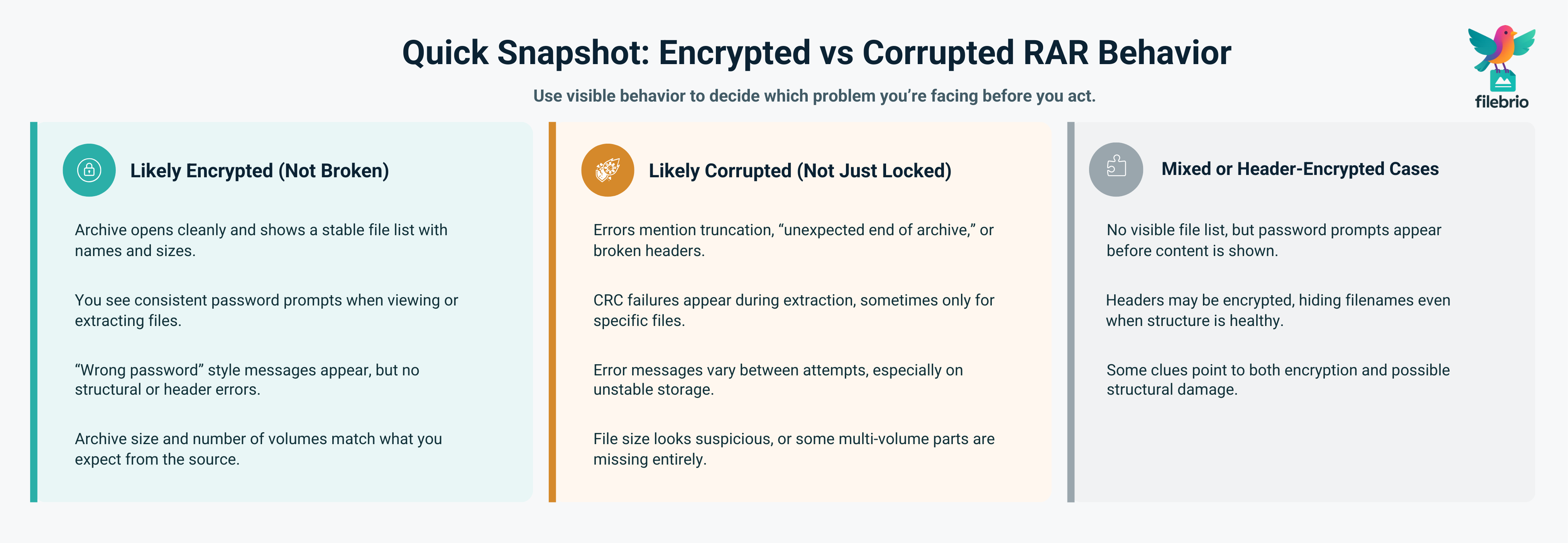 Many users mix these situations together. A normal password prompt can look like an error, while corruption warnings can seem like âwrong password.â People try passwords on a broken file or run repairs on an archive thatâs perfectly healthy but simply encrypted. RAR tools actually provide clear clues. Error messages, the presence or absence of a file list, how quickly failures occur, and even the archiveâs size all point toward either encryption or corruption.