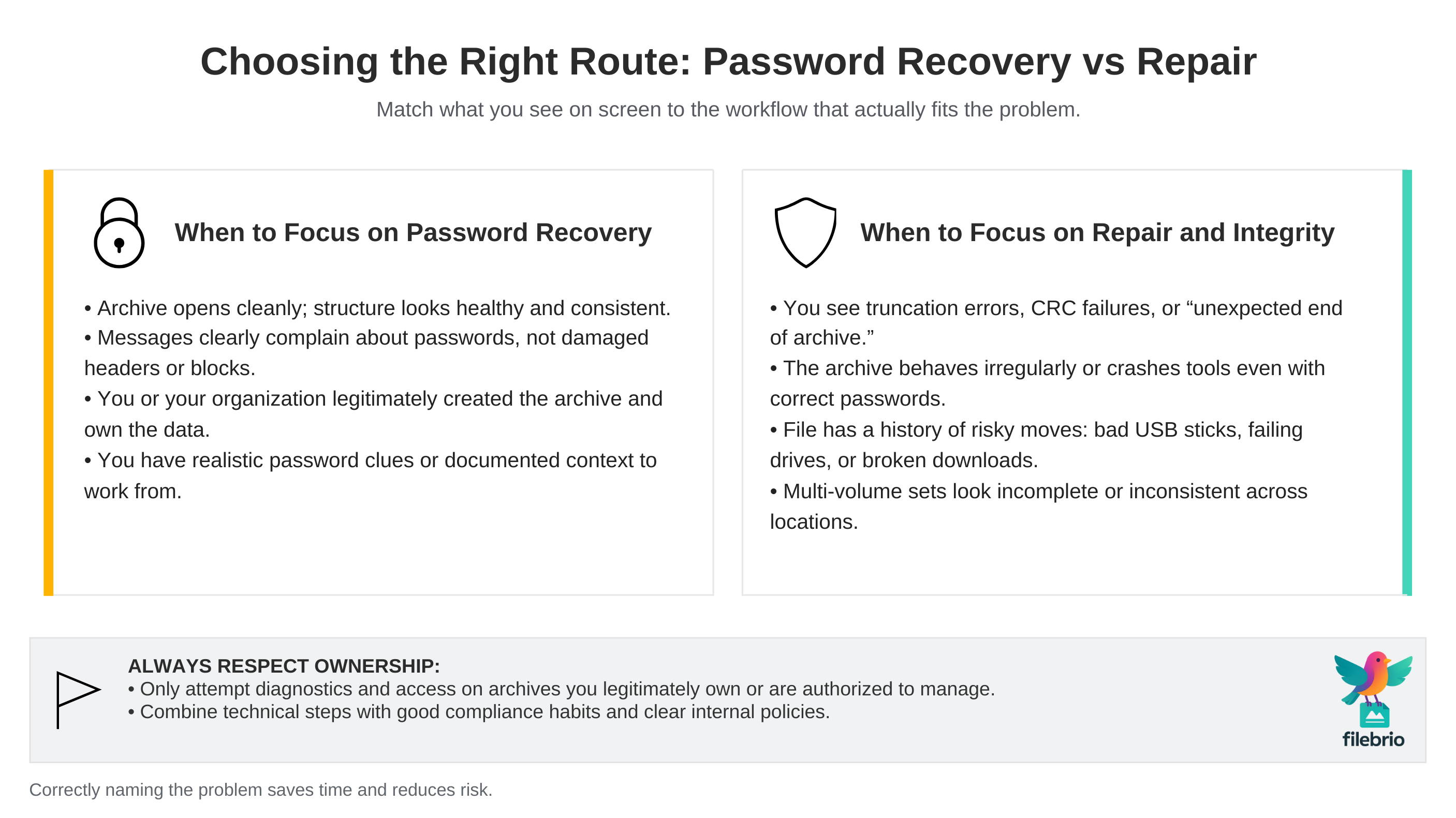 Regardless of whether the problem is encryption or corruption, all diagnostic and recovery efforts should apply only to archives you legitimately own or are formally authorized to manage. Good ownership verification habits, such as those described in checks to ensure youâre working with your own RAR files âď¸, are a core part of safe and compliant workflows.