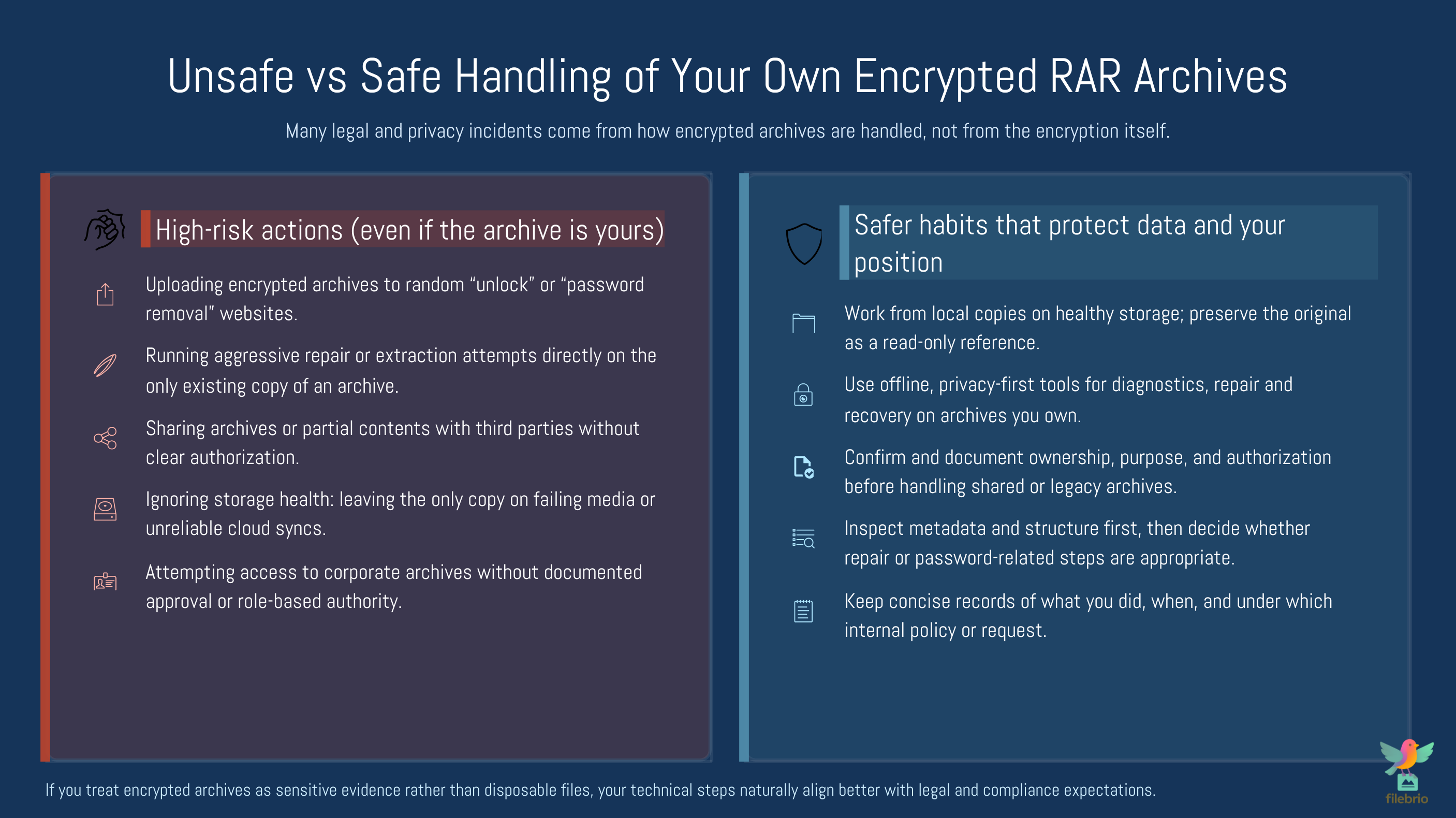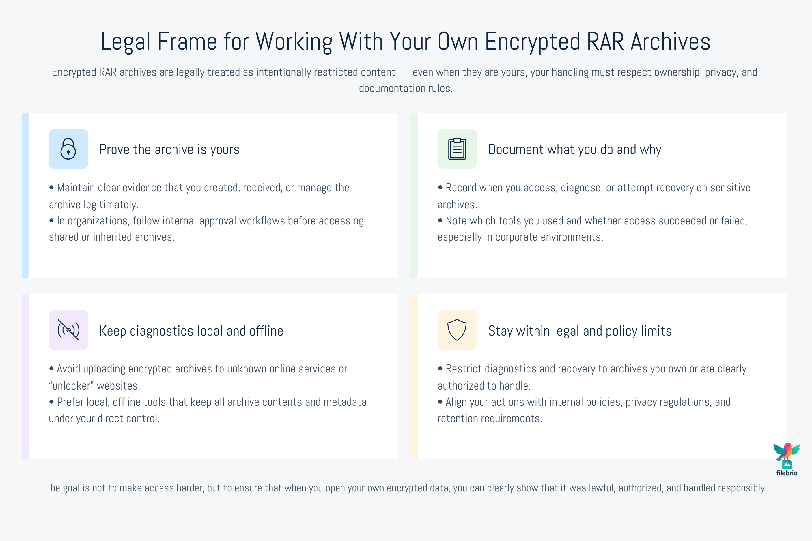 Encrypted archives carry legal expectations as much as technical ones. Even when you are working strictly with files you own, the way you handle access, diagnostics, and recovery attempts matters. Encrypted RAR/WinRAR archives are designed to restrict visibility, and that restriction has legal weight: only the rightful owner or an authorized party is permitted to inspect, recover, or modify them. Missteps such as uploading encrypted files to unknown online services, bypassing internal approval workflows, or failing to document your actions can create avoidable privacy, compliance, or organizational risks.