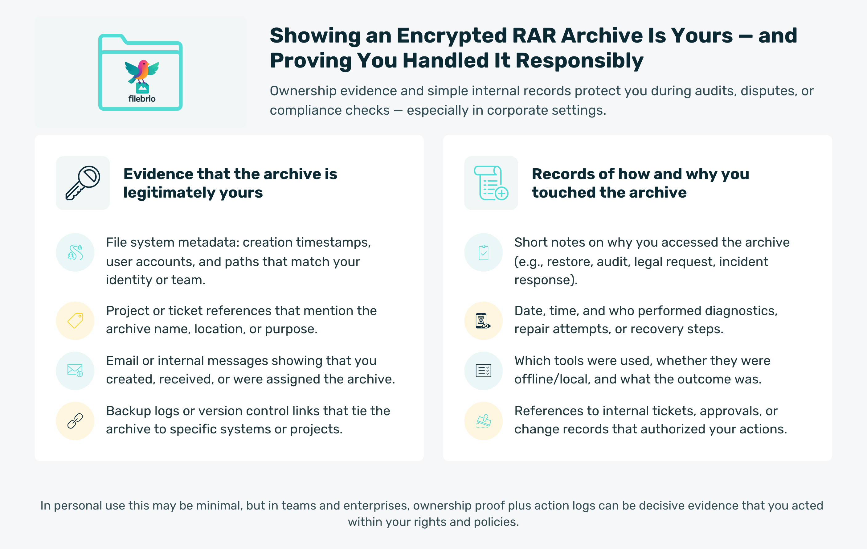 Ownership is the foundation of legal RAR handling. Even if you know that the archive is yours, an outside observer — a colleague, an auditor, or a compliance officer — does not know this unless you can demonstrate it clearly.