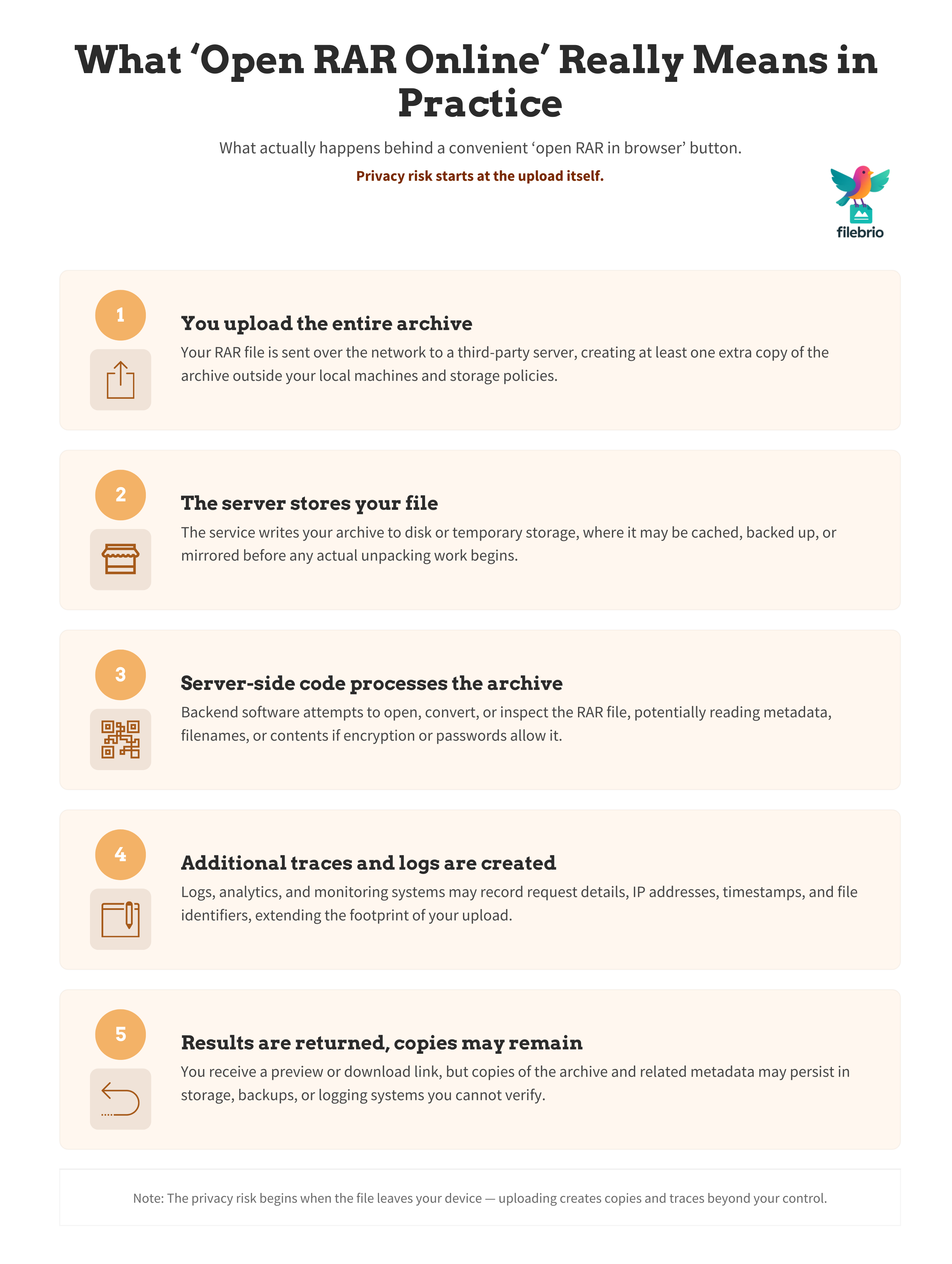 When you “open a RAR file online,” you are almost always doing one thing: uploading the entire archive to a third-party server. That server can keep copies, inspect metadata, log IP addresses, and potentially attempt to access your data, now or in the future. Even if the archive stays encrypted, you’ve handed someone a complete, portable package of your information that may sit in backups, logs, or analytics systems you will never see.