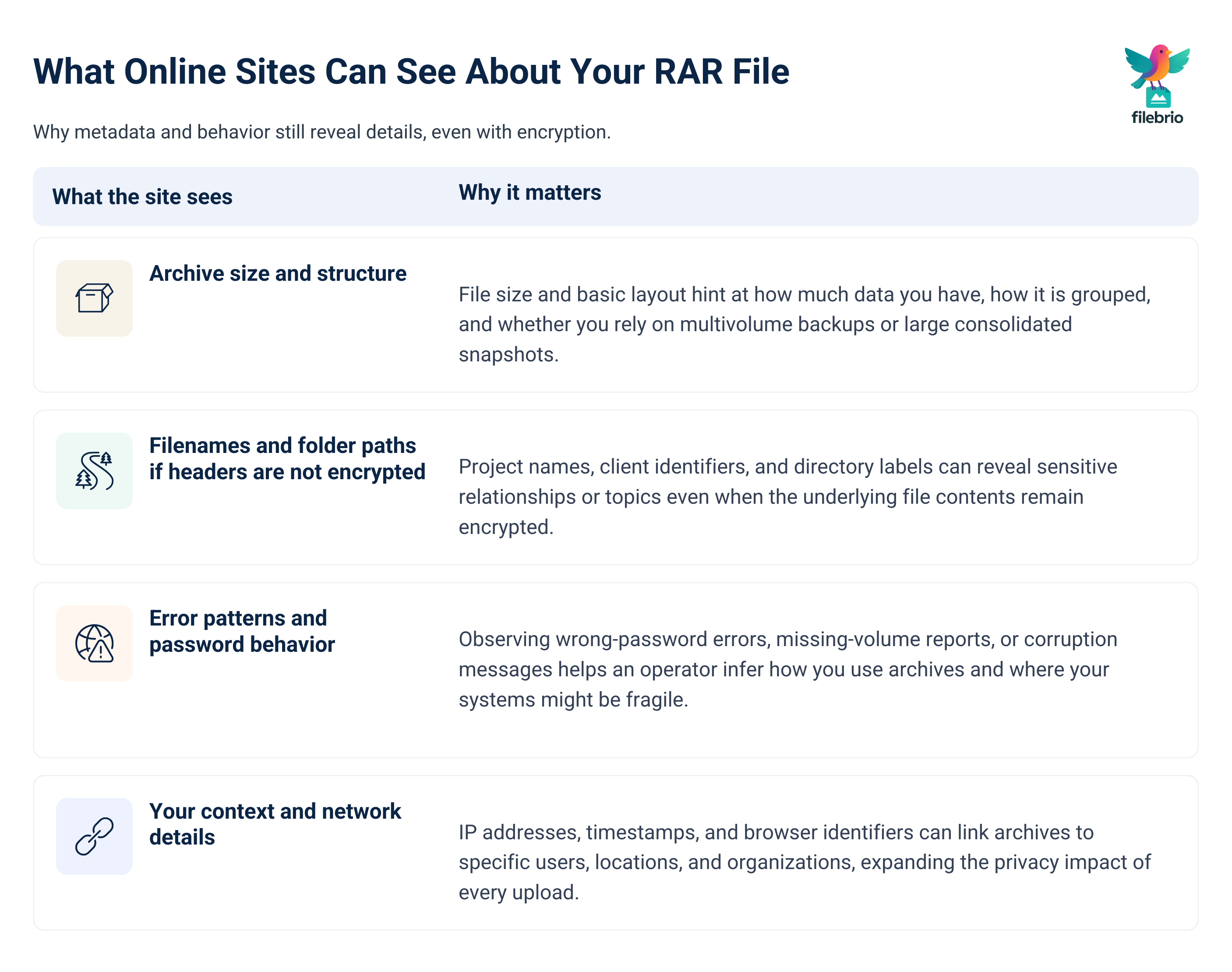Even if you do not enter a password, the archive itself might still leak information. Depending on how the RAR was created, filenames and headers can reveal project names, client names, folder layouts, or other sensitive labels. Understanding how encryption controls access to your protected RAR contents ↗️ helps clarify what is and isn’t hidden when you upload a file.