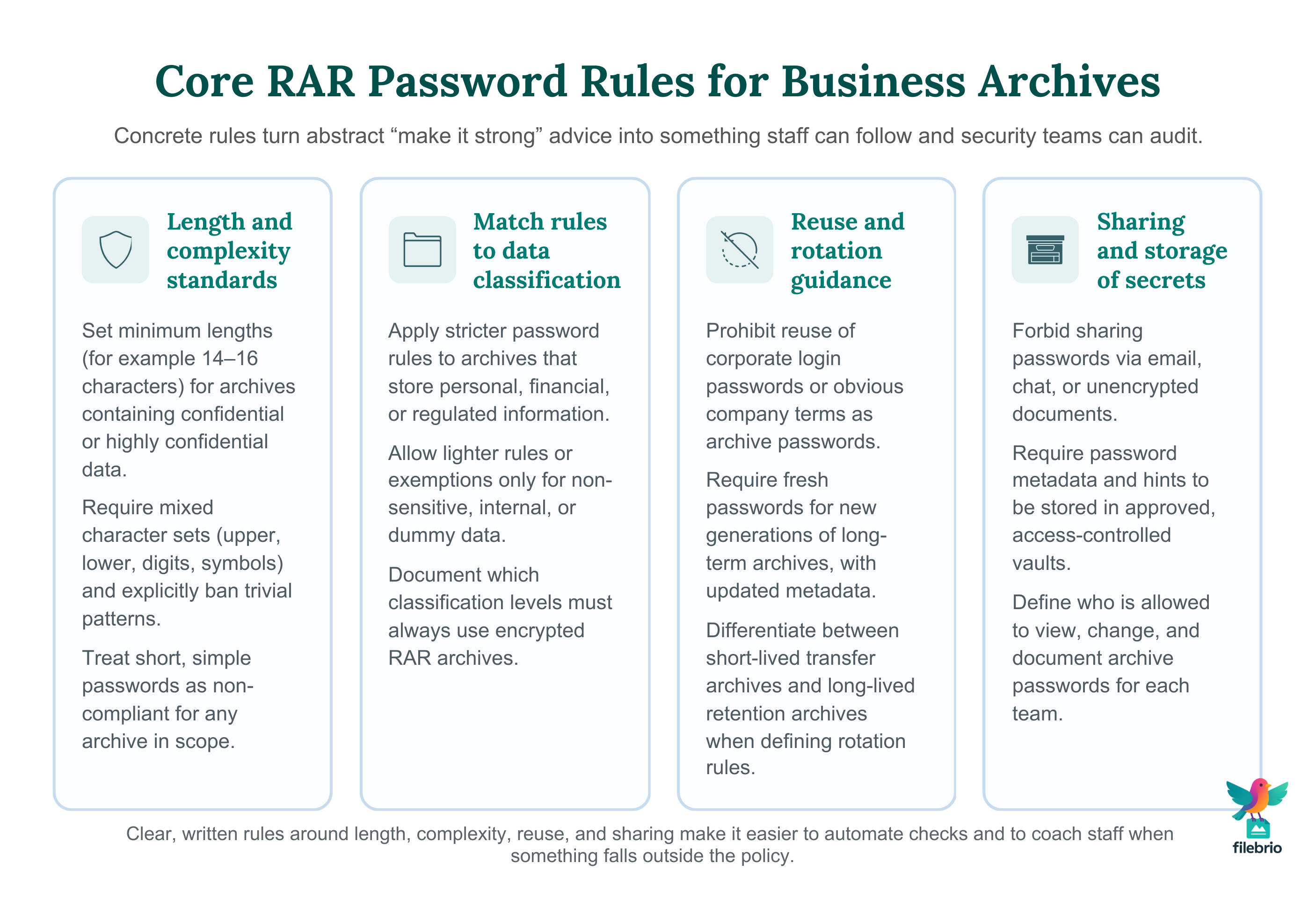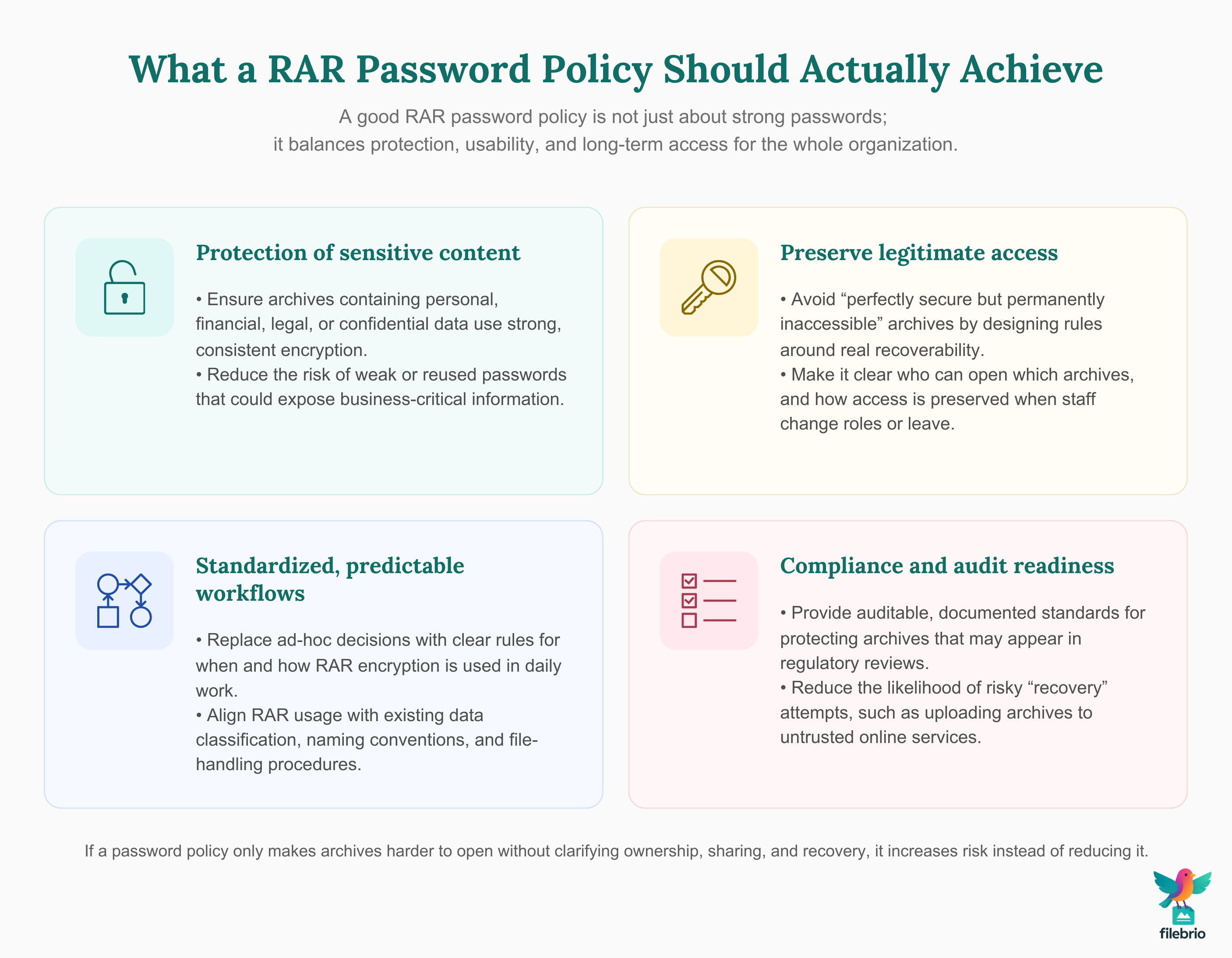 A formal password policy for RAR archives closes these gaps. It explicitly states when RAR encryption must be used, what “strong enough” means in your context, and which processes must be followed to avoid accidental data loss. It also links archive usage to broader practices for protecting sensitive files while allowing authorized recovery ↗️, so RAR is an integrated part of your security model instead of a risky side-channel.