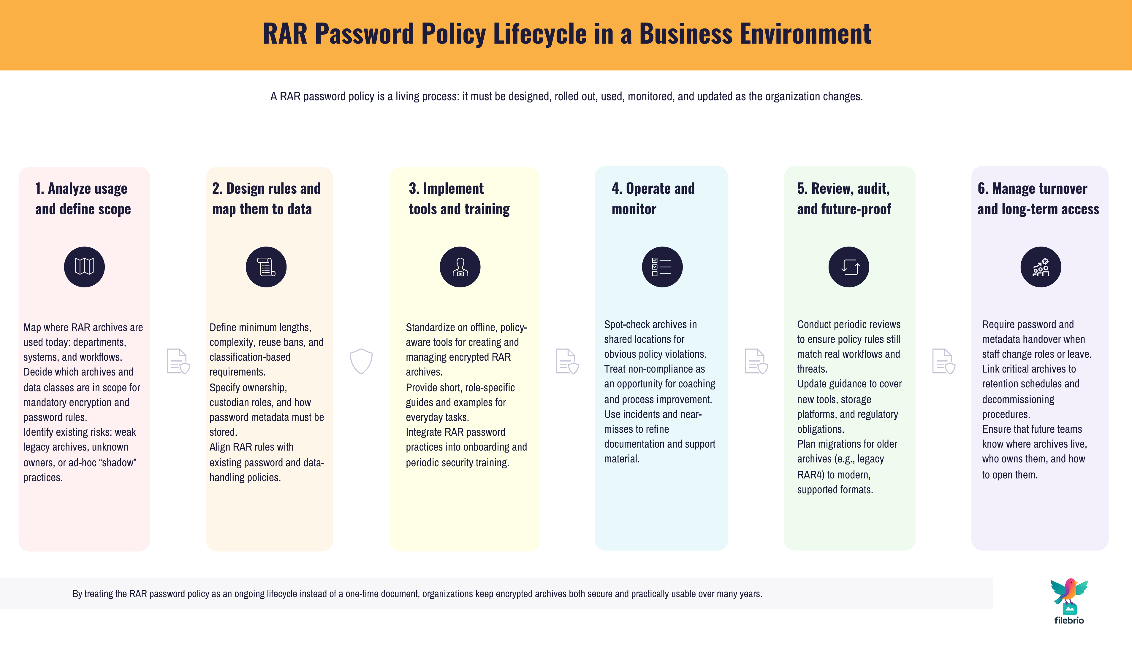 1. Provide simple, role-specific guides. Instead of sending staff the entire policy, give them short, practical guides: “How to create a compliant RAR archive for client data,” “How to store team password metadata,” and “What to do if you suspect a policy violation.” These can link into deeper technical or FAQ resources, like the RAR user guide and FAQ ↗️, for users who need more detail.
