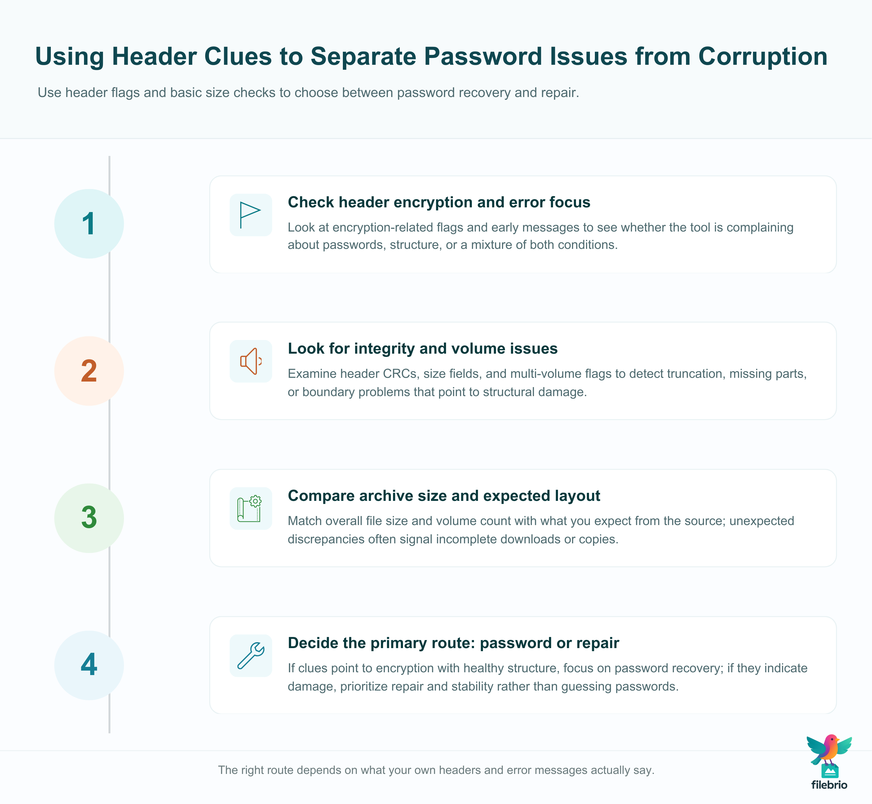 One of the most practical uses of header flags and metadata is distinguishing a simple password problem from deeper structural damage. Treating both issues the same way can lead to wasted effort — or even data loss if you repeatedly overwrite or re-download the wrong file.
