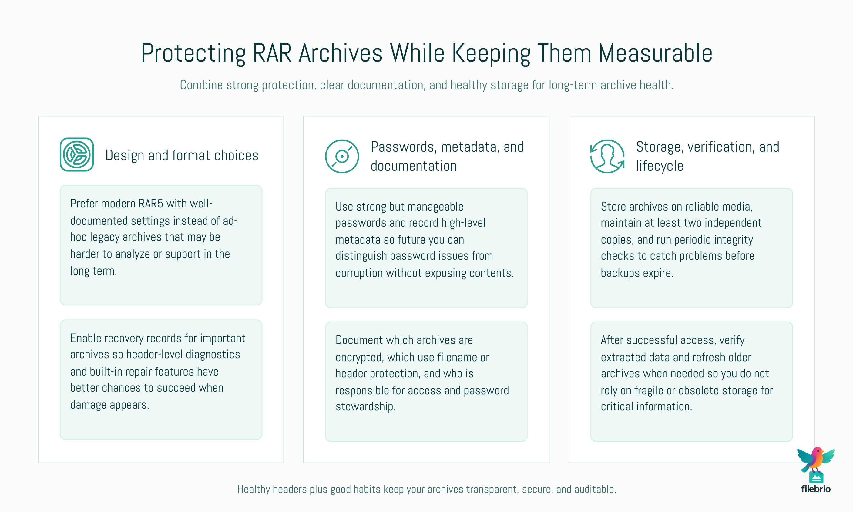 At an organizational level, it helps to define internal standards for encryption strength, recovery records, password policies, and metadata documentation. FileBrio’s guidance around safe security upgrades and future access planning — as discussed in how to strengthen RAR archive security while preserving future access ↗️ — is aligned with this balanced approach.