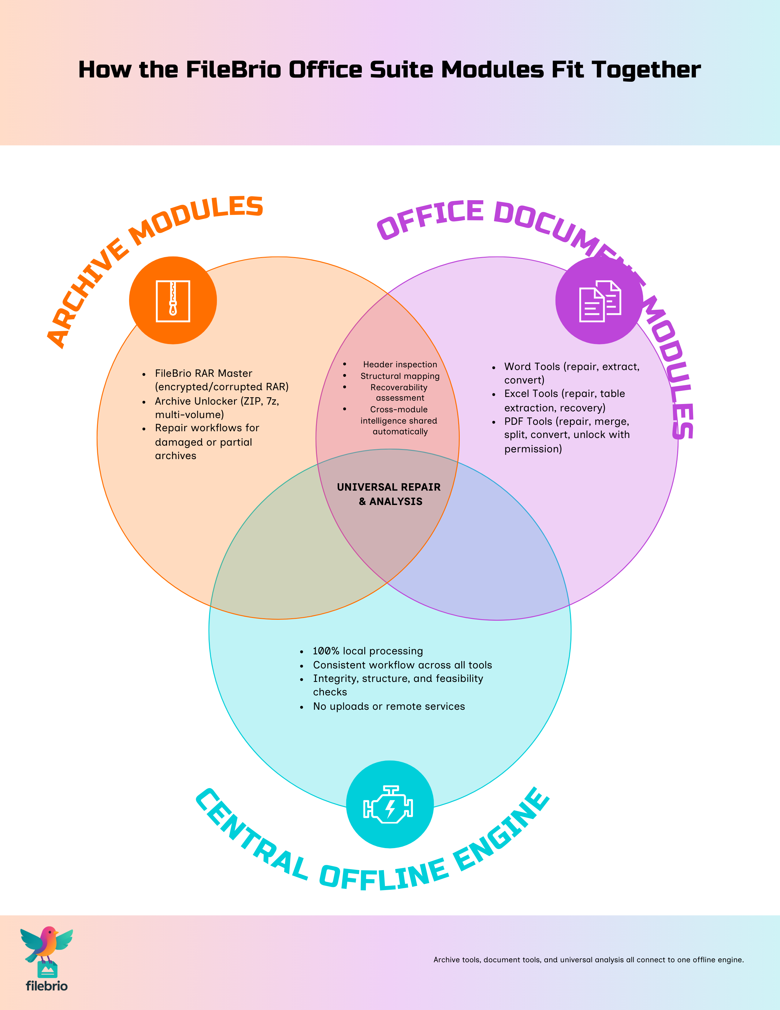 FileBrio Office Suite is structured around specialized modules that share a common interface and safety model. Each module focuses on one class of files, but they all follow the same basic workflow: analyze first, explain what is possible, then perform authorized recovery or repair using local computation only.