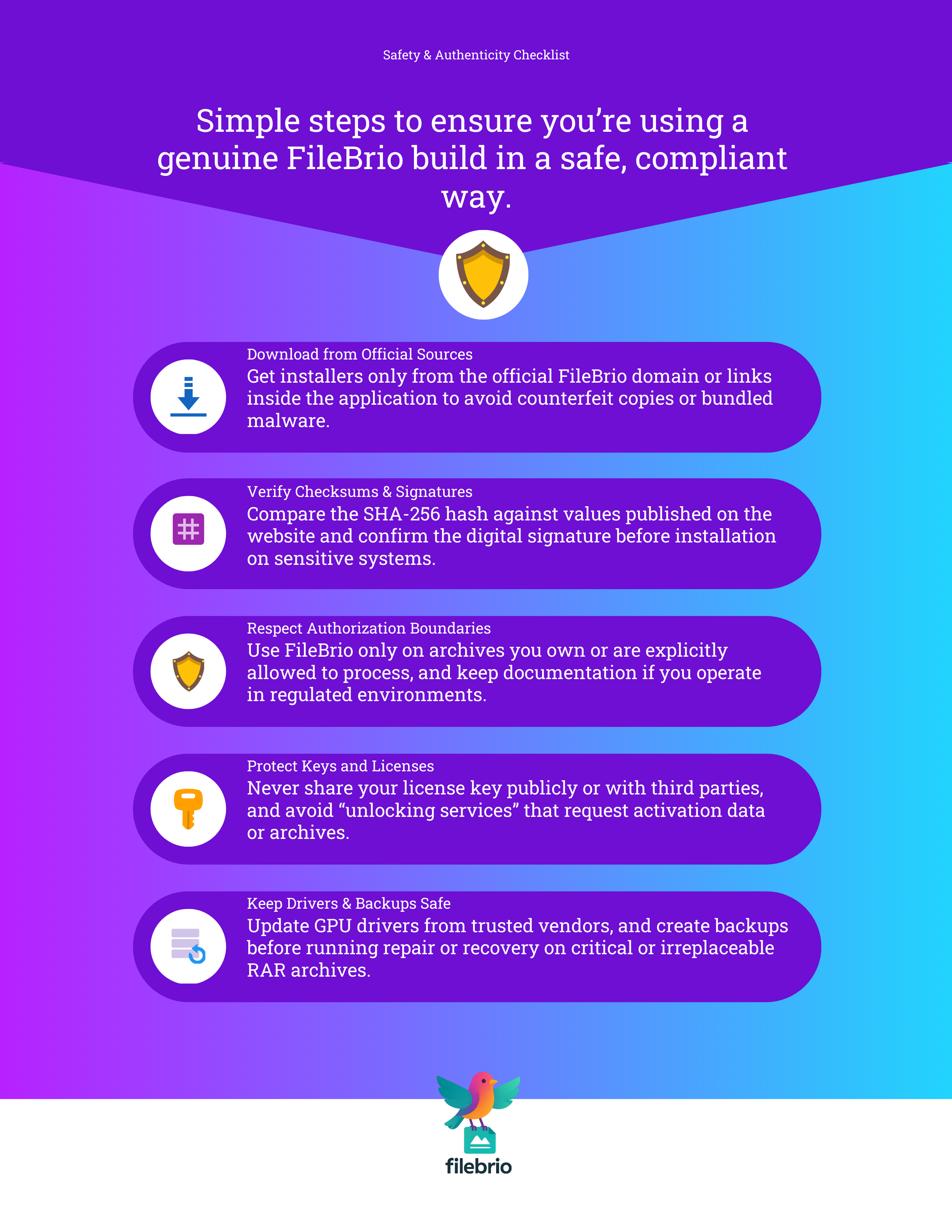 To ensure authenticity, all official FileBrio builds are: