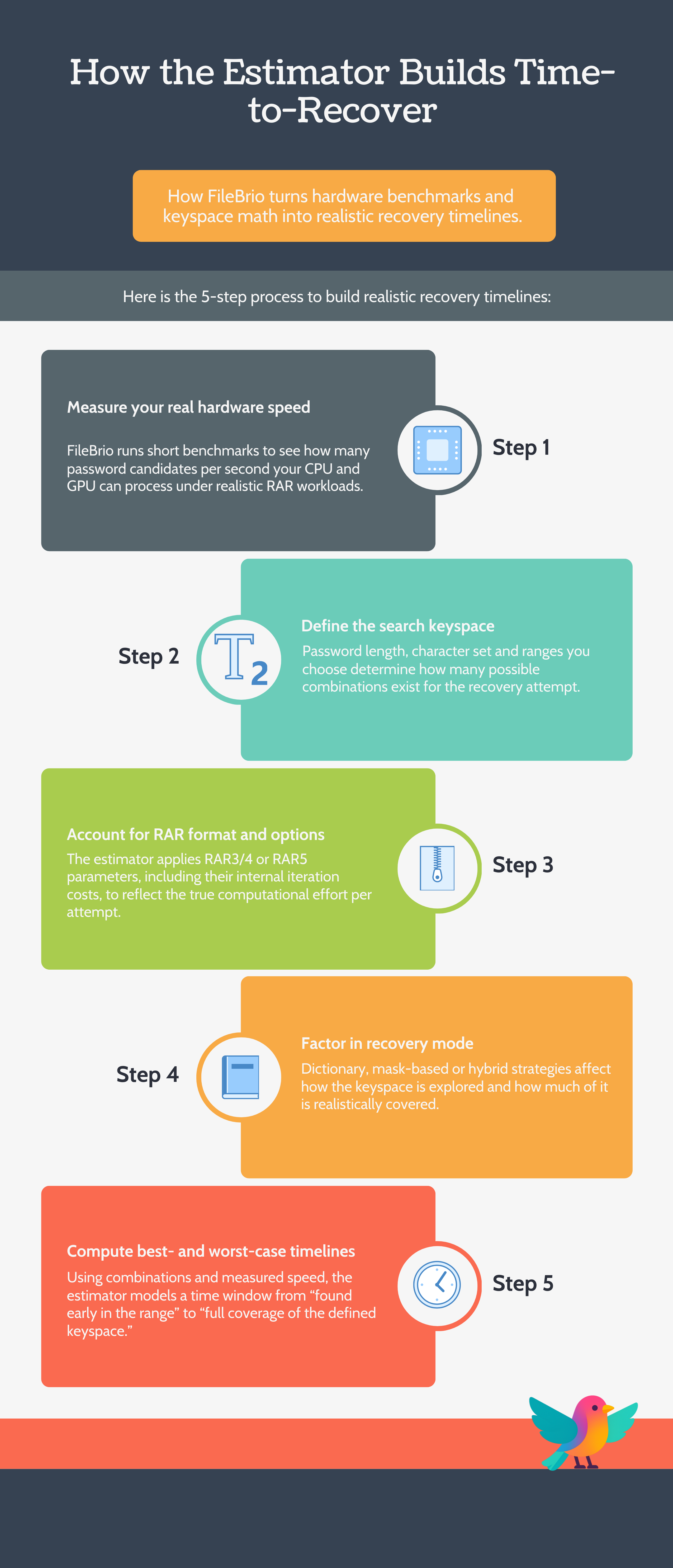 Does FileBrio’s estimator guarantee recovery? No. It provides time and feasibility estimates based on your chosen parameters and measured hardware speed. Actual outcomes depend entirely on the real password and whether it lies within the range you have defined.